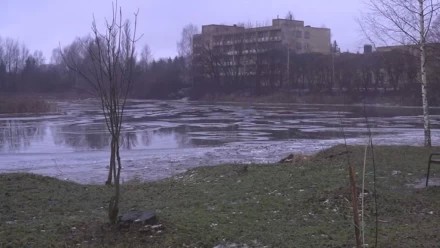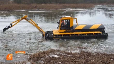 Машина-амфибия «Боцман» очищает участок береговой линии Вавиловского пруда в Афанасово.